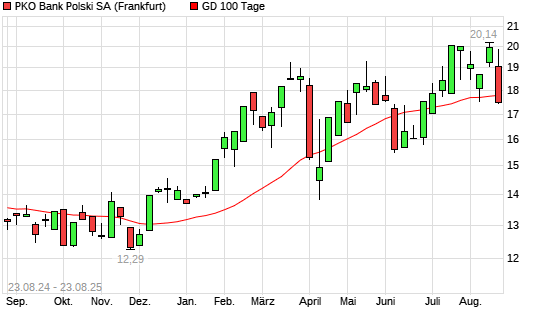Mit dem Rücksetzer auf 17,49 EUR hat die PKO Bank Polski-Aktie am 22.08.2025 die 100-Tage-Linie nach unten gekreuzt.