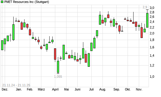 Mit dem Anstieg auf 2,84 EUR hat die PMET Resources-Aktie (ISIN CA73015G1046) am 20.11.2025 ein neues 12-Monats-Hoch erreicht und damit den Kurs vom 25.07.2025 eingestellt.