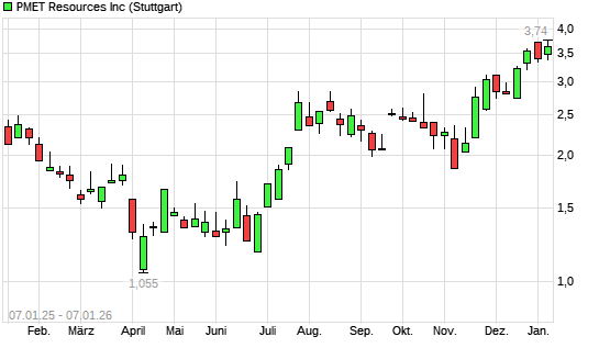 Mit dem Anstieg auf 3,70 EUR hat die PMET Resources-Aktie (ISIN CA73015G1046) am 06.01.2026 ein neues 12-Monats-Hoch erreicht und damit den Kurs vom 30.12.2025 eingestellt.