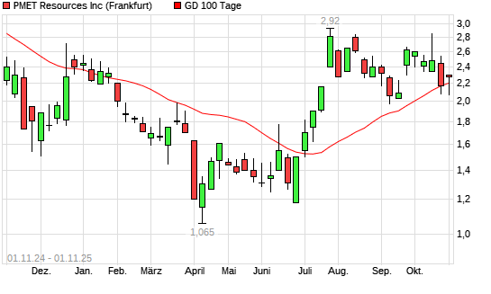 Mit dem Anstieg auf 2,27 EUR hat die PMET Resources-Aktie am 31.10.2025 die 100-Tage-Linie nach oben gekreuzt.