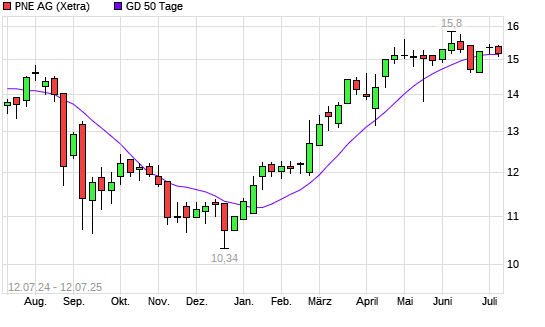 Mit dem Rücksetzer auf 15,04 EUR hat die PNE Wind-Aktie am 11.07.2025 die 50-Tage-Linie nach unten gekreuzt.