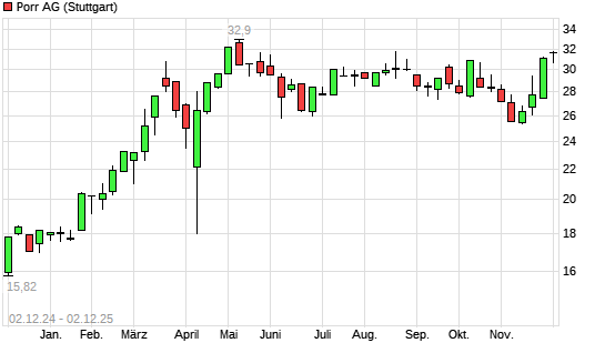 Mit dem Anstieg auf 31,55 EUR hat die PORR-Aktie (ISIN AT0000609607) am 01.12.2025 ein neues 6-Monats-Hoch erreicht und damit den Kurs vom 28.11.2025 eingestellt.