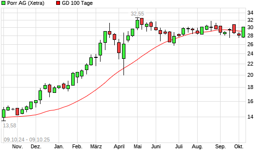 Mit dem Anstieg auf 30,10 EUR hat die PORR-Aktie am 08.10.2025 die 100-Tage-Linie nach oben gekreuzt.