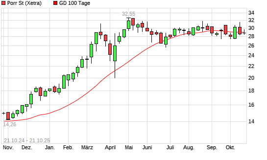 Mit dem Anstieg auf 29,55 EUR hat die PORR-Aktie am 20.10.2025 die 100-Tage-Linie nach oben gekreuzt.