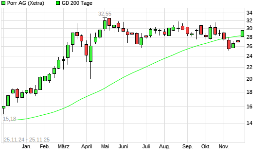 Mit dem Anstieg auf 29,15 EUR hat die PORR-Aktie am 24.11.2025 die 200-Tage-Linie nach oben gekreuzt.
