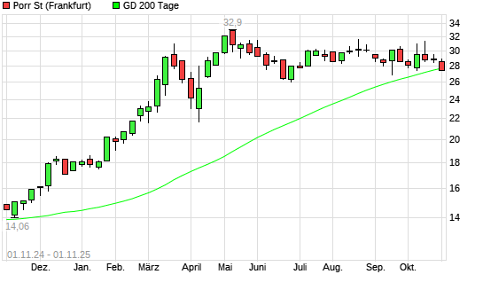 Mit dem Rücksetzer auf 27,20 EUR hat die PORR-Aktie am 31.10.2025 die 200-Tage-Linie nach unten gekreuzt.