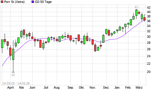 Mit dem Rücksetzer auf 36,00 EUR hat die PORR-Aktie am 13.03.2026 die 50-Tage-Linie nach unten gekreuzt.