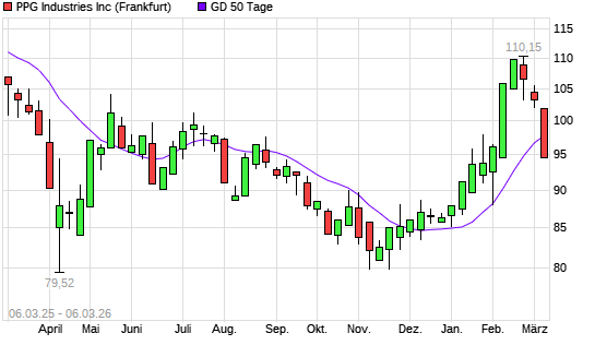 Mit dem Rücksetzer auf 95,48 EUR hat die PPG Industries-Aktie am 05.03.2026 die 50-Tage-Linie nach unten gekreuzt.