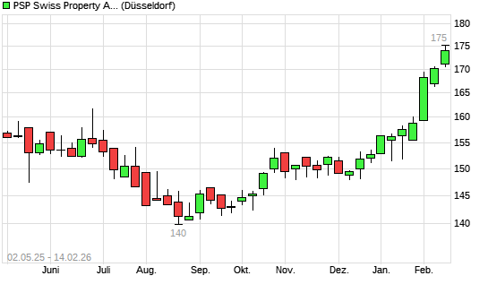 Mit dem Anstieg auf 175,00 EUR hat die PSP Swiss Property-Aktie (ISIN CH0018294154) am 13.02.2026 ein neues All-Time-High erreicht und damit den Kurs vom 12.02.2026 eingestellt.
