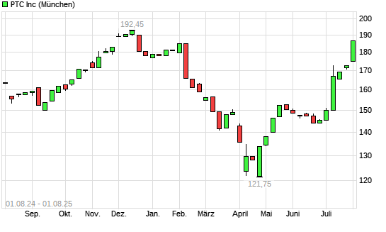 Mit dem Anstieg auf 190,15 EUR hat die PTC-Aktie (ISIN US69370C1009) am 31.07.2025 ein neues 6-Monats-Hoch erreicht und damit den Kurs vom 03.02.2025 eingestellt.
