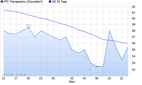 Mit dem Rücksetzer auf 54,50 EUR hat die PTC Therapeutics-Aktie am 12.03.2026 die 20-Tage-Linie nach unten gekreuzt.