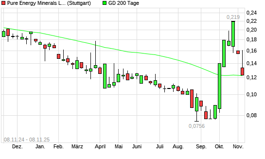Mit dem Rücksetzer auf 0,11 EUR hat die PURE ENERGY MINERALS-Aktie am 07.11.2025 die 200-Tage-Linie nach unten gekreuzt.