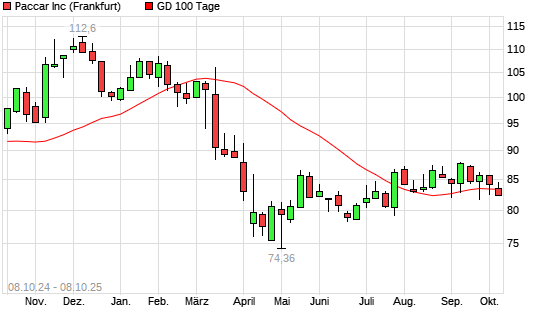 Mit dem Rücksetzer auf 82,99 EUR hat die Paccar-Aktie am 07.10.2025 die 100-Tage-Linie nach unten gekreuzt.