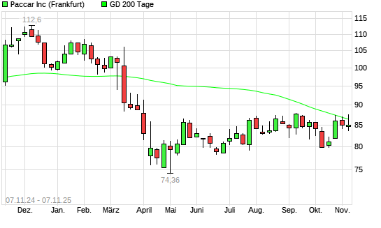 Mit dem Rücksetzer auf 85,54 EUR hat die Paccar-Aktie am 06.11.2025 die 200-Tage-Linie nach unten gekreuzt.