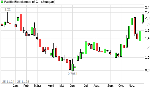 Mit dem Anstieg auf 2,11 EUR hat die Pacific Biosciences of California-Aktie (ISIN US69404D1081) am 24.11.2025 ein neues 6-Monats-Hoch erreicht und damit den Kurs vom 31.10.2025 eingestellt.