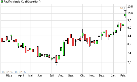 Mit dem Anstieg auf 10,20 EUR hat die Pacific Metals Co-Aktie (ISIN JP3448000004) am 05.02.2025 ein neues 12-Monats-Hoch erreicht und damit den Kurs vom 03.02.2025 eingestellt.