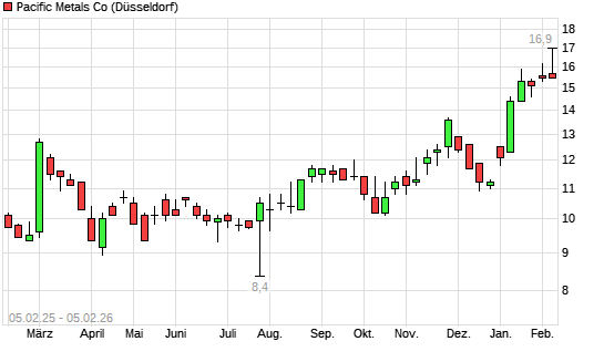 Mit dem Anstieg auf 16,80 EUR hat die Pacific Metals Co-Aktie (ISIN JP3448000004) am 04.02.2026 ein neues 3-Jahres-Hoch erreicht und damit den Kurs vom 29.01.2026 eingestellt.
