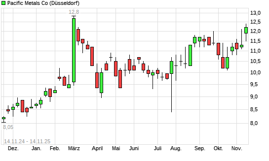 Mit dem Anstieg auf 12,10 EUR hat die Pacific Metals Co-Aktie (ISIN JP3448000004) am 13.11.2025 ein neues 6-Monats-Hoch erreicht und damit den Kurs vom 04.11.2025 eingestellt.