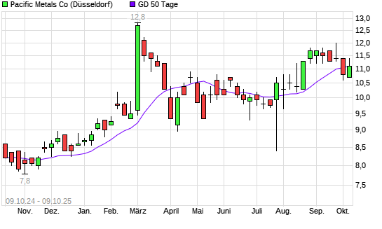 Mit dem Anstieg auf 11,40 EUR hat die Pacific Metals Co-Aktie am 08.10.2025 die 50-Tage-Linie nach oben gekreuzt.