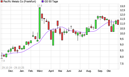 Mit dem Rücksetzer auf 11,00 EUR hat die Pacific Metals Co-Aktie am 28.10.2025 die 50-Tage-Linie nach unten gekreuzt.