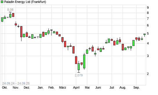 Mit dem Anstieg auf 4,95 EUR hat die Paladin Energy-Aktie (ISIN AU000000PDN8) am 23.09.2025 ein neues 6-Monats-Hoch erreicht und damit den Kurs vom 22.09.2025 eingestellt.