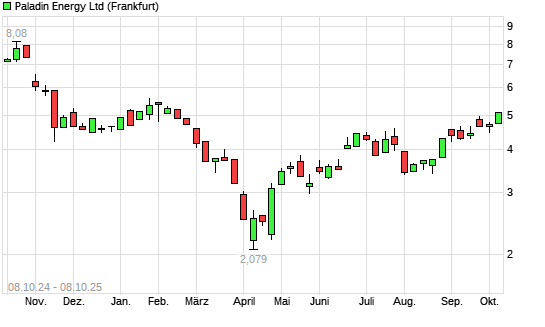 Mit dem Anstieg auf 5,08 EUR hat die Paladin Energy-Aktie (ISIN AU000000PDN8) am 07.10.2025 ein neues 6-Monats-Hoch erreicht und damit den Kurs vom 24.09.2025 eingestellt.