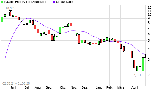 Mit dem Rücksetzer auf 3,25 EUR hat die Paladin Energy-Aktie am 30.04.2025 die 50-Tage-Linie nach unten gekreuzt.