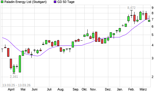 Mit dem Rücksetzer auf 7,18 EUR hat die Paladin Energy-Aktie am 12.03.2026 die 50-Tage-Linie nach unten gekreuzt.
