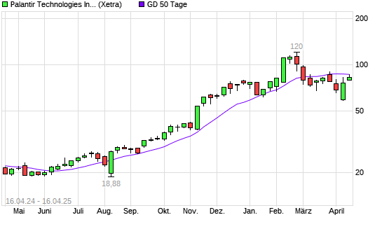 Mit dem Anstieg auf 87,33 EUR hat die Palantir Technologies-Aktie am 15.04.2025 die 50-Tage-Linie nach oben gekreuzt.