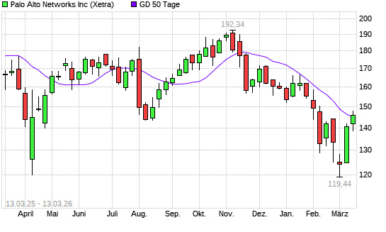 Mit dem Anstieg auf 145,46 EUR hat die Palo Alto Networks-Aktie am 12.03.2026 die 50-Tage-Linie nach oben gekreuzt.