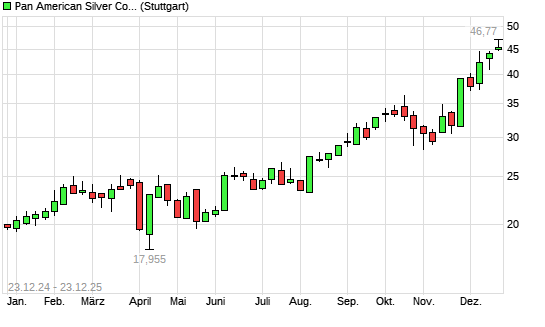 Mit dem Anstieg auf 45,57 EUR hat die Pan American Silver-Aktie (ISIN CA6979001089) am 22.12.2025 ein neues All-Time-High erreicht und damit den Kurs vom 19.12.2025 eingestellt.