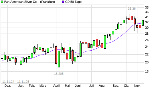 Mit dem Anstieg auf 32,70 EUR hat die Pan American Silver-Aktie am 10.11.2025 die 50-Tage-Linie nach oben gekreuzt.