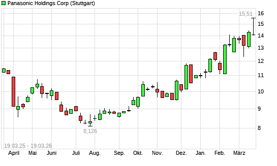 Mit dem Anstieg auf 14,68 EUR hat die Panasonic-Aktie (ISIN JP3866800000) am 18.03.2026 ein neues 10-Jahres-Hoch erreicht und damit den Kurs vom 12.03.2026 eingestellt.