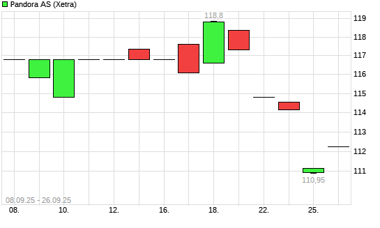 Mit dem Rücksetzer auf 111,00 EUR hat die Pandora-Aktie (ISIN DK0060252690) am 25.09.2025 ein neues 12-Monats-Tief erreicht und damit den Kurs vom 03.09.2025 eingestellt.