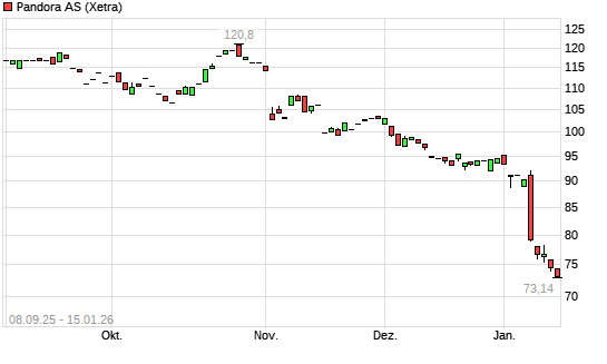 Mit dem Rücksetzer auf 74,24 EUR hat die Pandora-Aktie (ISIN DK0060252690) am 14.01.2026 ein neues 12-Monats-Tief erreicht und damit den Kurs vom 13.01.2026 eingestellt.