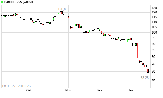 Mit dem Rücksetzer auf 69,26 EUR hat die Pandora-Aktie (ISIN DK0060252690) am 19.01.2026 ein neues 3-Jahres-Tief erreicht und damit den Kurs vom 15.01.2026 eingestellt.