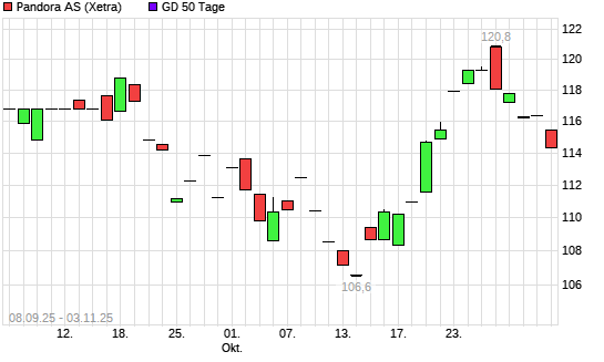 Mit dem Rücksetzer auf 110,75 EUR hat die Pandora-Aktie am 03.11.2025 die 50-Tage-Linie nach unten gekreuzt.