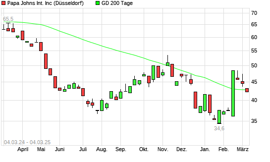 Mit dem Rücksetzer auf 42,00 EUR hat die Papa Johns International-Aktie am 03.03.2025 die 200-Tage-Linie nach unten gekreuzt.