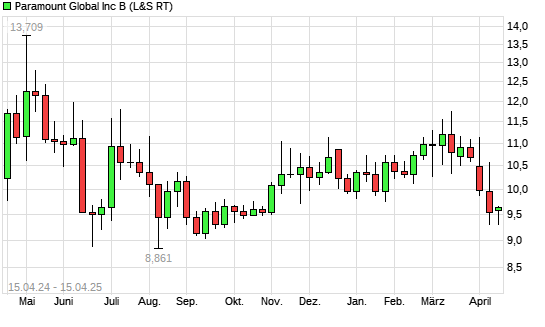 Mit dem Rücksetzer auf 9,44 EUR hat die Paramount Global-Aktie (ISIN US92556H2067) am 14.04.2025 ein neues 6-Monats-Tief erreicht und damit den Kurs vom 14.10.2024 eingestellt.