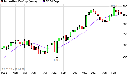 Mit dem Rücksetzer auf 635,00 EUR hat die Parker-Hannifin-Aktie am 21.02.2025 die 50-Tage-Linie nach unten gekreuzt.