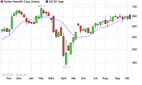 Mit dem Rücksetzer auf 638,40 EUR hat die Parker-Hannifin-Aktie am 09.10.2025 die 50-Tage-Linie nach unten gekreuzt.
