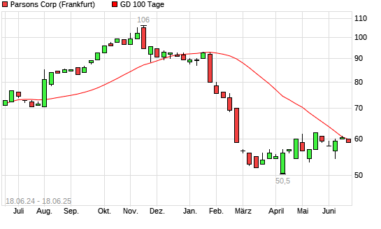 Mit dem Rücksetzer auf 59,50 EUR hat die Parsons-Aktie am 17.06.2025 die 100-Tage-Linie nach unten gekreuzt.