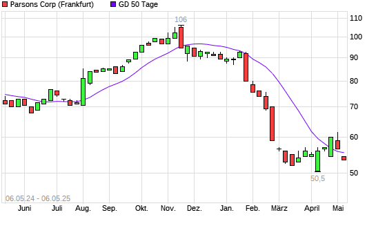 Mit dem Rücksetzer auf 54,50 EUR hat die Parsons-Aktie am 05.05.2025 die 50-Tage-Linie nach unten gekreuzt.