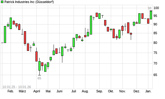 Mit dem Anstieg auf 98,50 EUR hat die Patrick Industries-Aktie (ISIN US7033431039) am 09.01.2026 ein neues All-Time-High erreicht und damit den Kurs vom 25.08.2025 eingestellt.