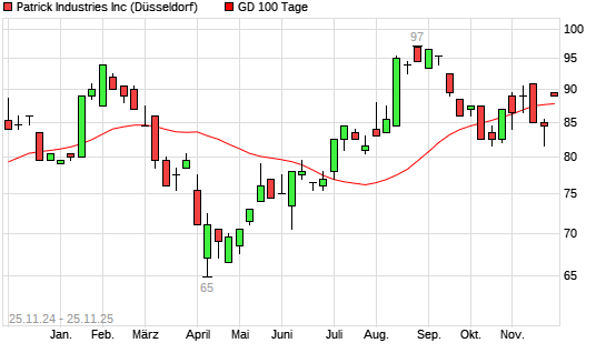 Mit dem Anstieg auf 90,00 EUR hat die Patrick Industries-Aktie am 24.11.2025 die 100-Tage-Linie nach oben gekreuzt.
