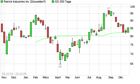 Mit dem Anstieg auf 84,50 EUR hat die Patrick Industries-Aktie am 22.10.2025 die 200-Tage-Linie nach oben gekreuzt.