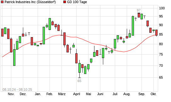 Mit dem Rücksetzer auf 84,50 EUR hat die Patrick Industries-Aktie am 07.10.2025 die 100-Tage-Linie nach unten gekreuzt.