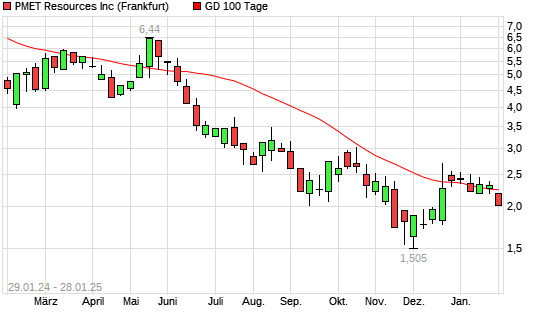 Mit dem Rücksetzer auf 2,20 EUR hat die Patriot Battery Metals-Aktie am 27.01.2025 die 100-Tage-Linie nach unten gekreuzt.
