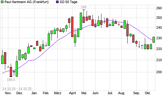 Mit dem Anstieg auf 229,00 EUR hat die Paul Hartmann-Aktie am 13.10.2025 die 50-Tage-Linie nach oben gekreuzt.