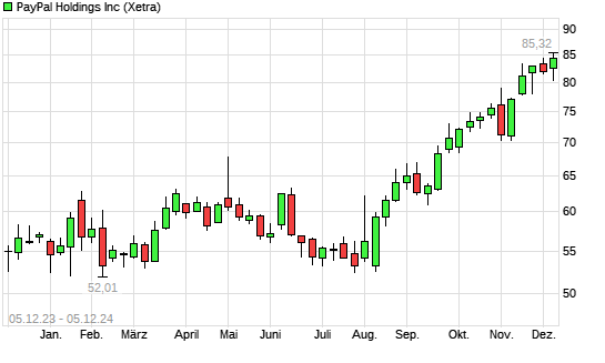 Mit dem Anstieg auf 85,50 EUR hat die PayPal-Aktie (ISIN US70450Y1038) am 04.12.2024 ein neues 12-Monats-Hoch erreicht und damit den Kurs vom 22.11.2024 eingestellt.